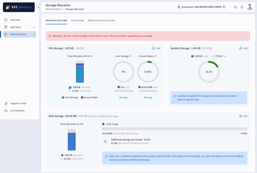 Go to the Cloud Console and click on the Administration > Storage Allocation tab for managing the File storage. Refer to the image below and read on for the details.