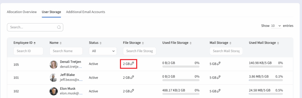 To increase the Files storage for a user, click on the Edit icon near his/her name in the Users tab, or