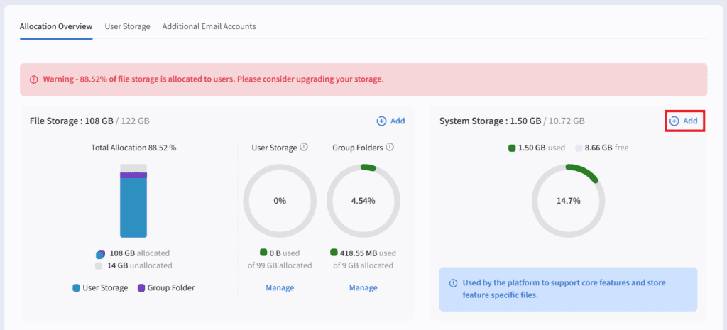 When you need to upgrade the storage, click on the “+Add” in the System Storage.
