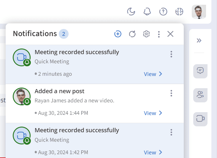 Click on the ‘Bell’ icon to open the ‘Notifications’ panel to view all your notifications. The notifications are displayed with the most recent one on top You can scroll through each notification and mark them as read/unread. Also, you can clear each notification from the ‘Notifications’ pop-up.