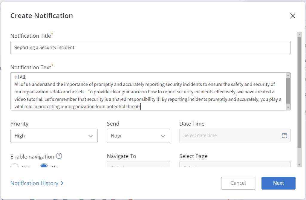 Click on the Next button to preview the notification. You can view the notification name, description, scheduled date & time, navigation to organizational unit/department/team/user and navigation destination.