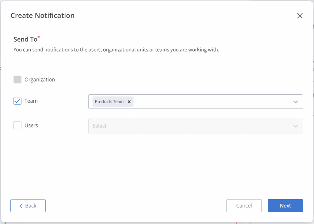 In case you want to send the notification to the Organizational units, team(s) or users, check the checkbox and select the respective organizational units, teams or users.