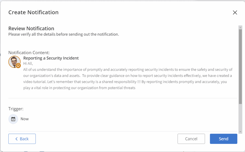 Click on the Send button to send the notification on the scheduled date & time to the respective organizational unit/department/team/user.