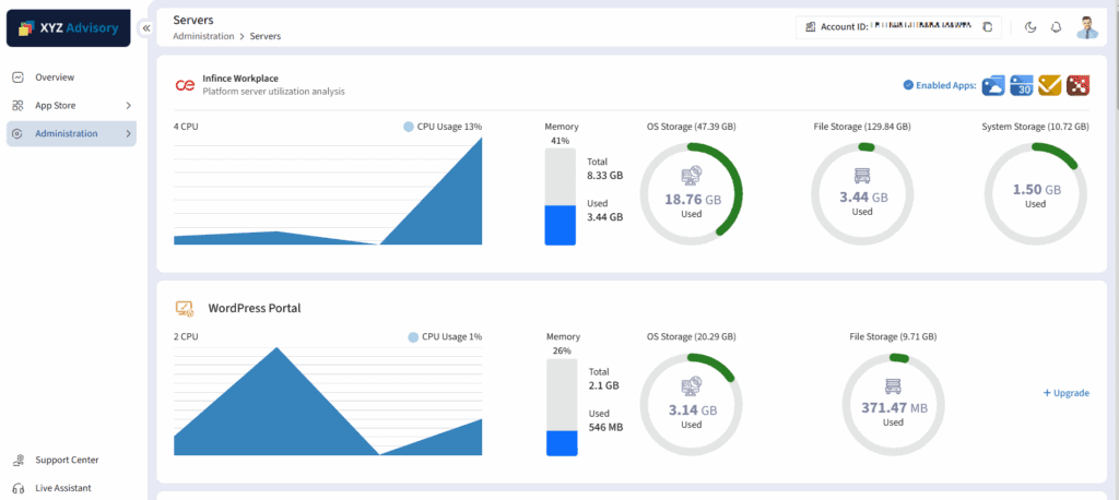 For each of these servers, you can monitor the CPU usage and the storage usage for OS, Files or DB. You can choose to upgrade the File Storage when it is nearing the limits of the current capacity.