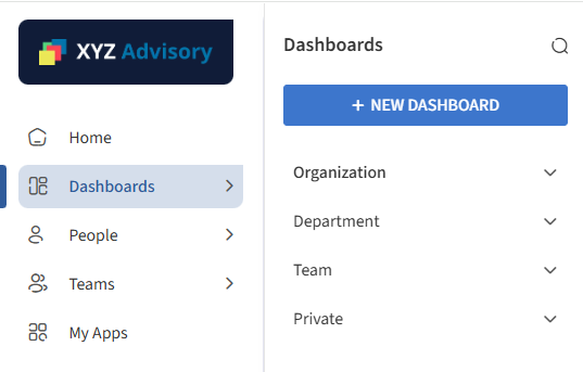 Dashboards are great tools for collaboration. A Dashboard is an information management tool that can visually track and analyze what is happening in the business. Dashboards can be set up for the Organization, Organizational Units, and Teams. Users can also keep Private dashboards for individual purposes. It is also a great tool for organizational communication and information sharing.