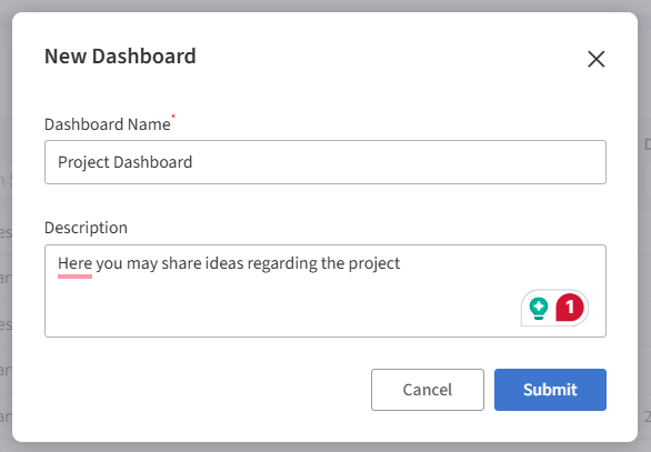 In the Create New Dashboard pop-up, enter the name and description of the dashboard and click the Submit button.