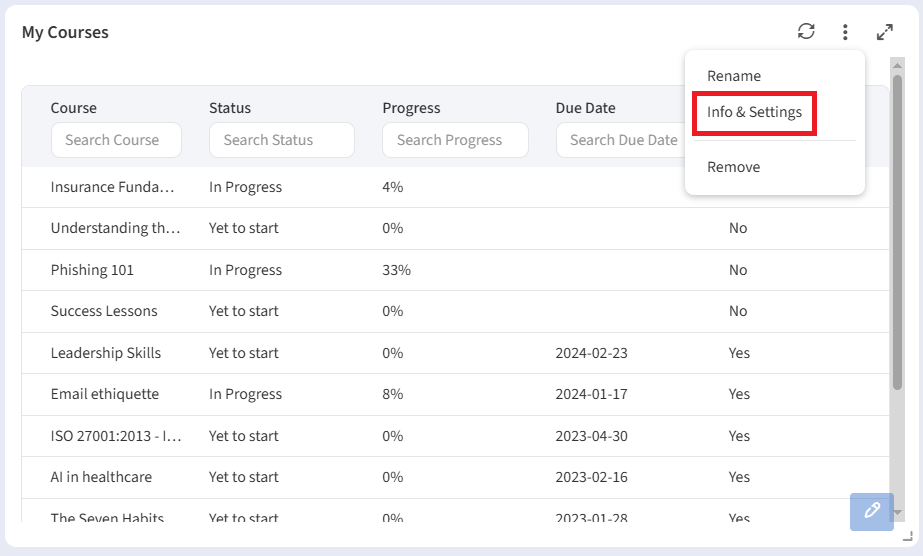 To view the Dashboard Info, click the Dashboard Settings icon (three dots icon) and the Dashboard Info option.