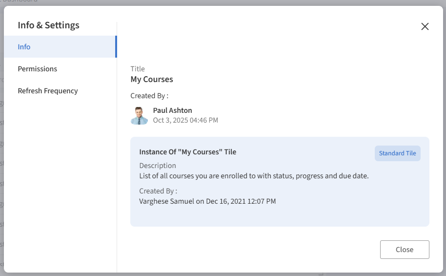 The Info tab displays the basic information of the tile, such as created by, description, etc.