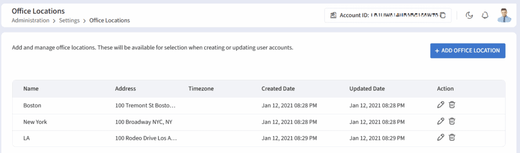 The locations defined here will be listed as options for the “Office Location” field when you add a new user/employee to the organization.