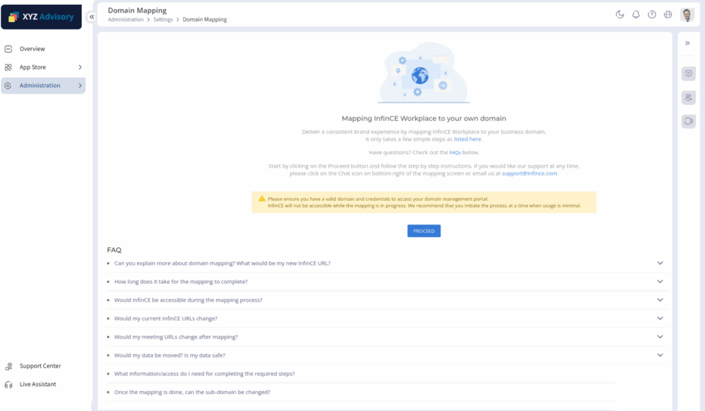 - In your Cloud Console, click on Administration > Settings > Domain Mapping. To initiate the process, click on Proceed button.