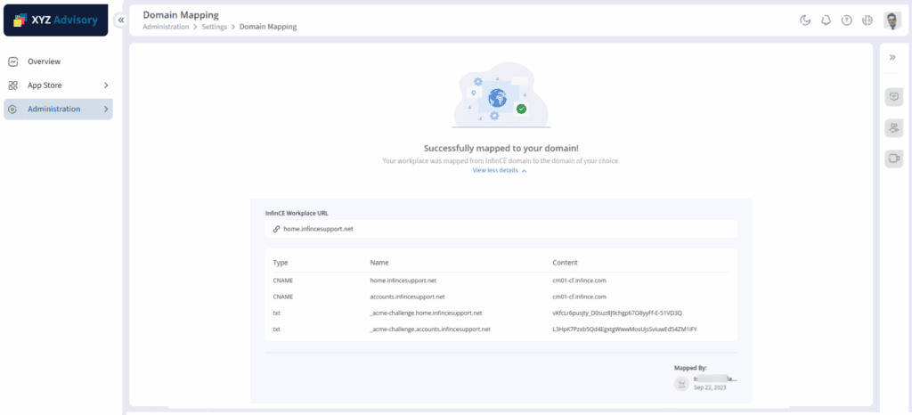 - After successful migration, you can view the domain mapping details (Administration > Settings > Domain Mapping) in the Infince workplace.