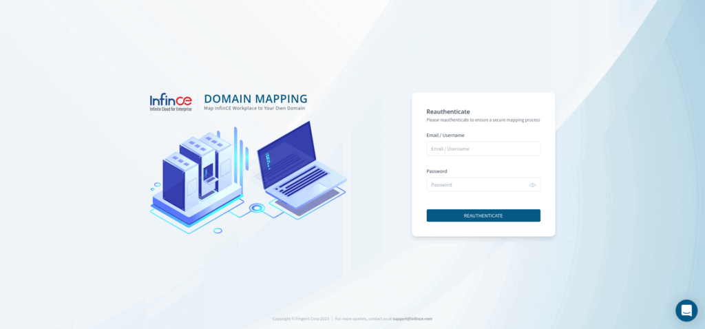 Domain mapping allows you to take corporate branding of Infince to the next level, by white-labeling your Workplace URLs. For e.g., If your business domain is xyzbiz.com, your default Infince URL would be ”https://xyzbiz.infince.com”. Instead, if you map Infince to your own domain with sub-domain as ”portal”, your new Infince URL would be “https://portal.xyzbiz.com”. You can choose the sub-domain name during the mapping process.