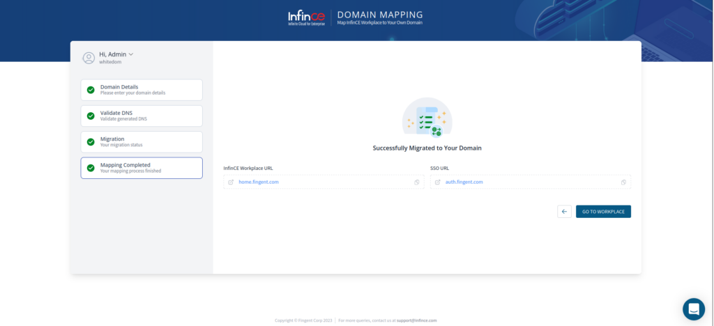 - When the Migration process gets completed, you can view the Infince workplace URL and SSO URL in the ‘Mapping Completed’ section.