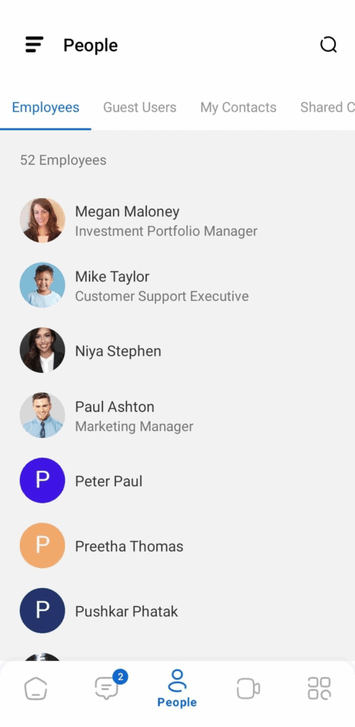 Click on the People menu at the bottom of the Mobile App and select the employees tab to view the list of all colleagues in your organization. Tap on the profile of a person to view his professional contact information. You can initiate calls, message or call the person from here.