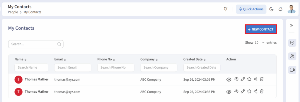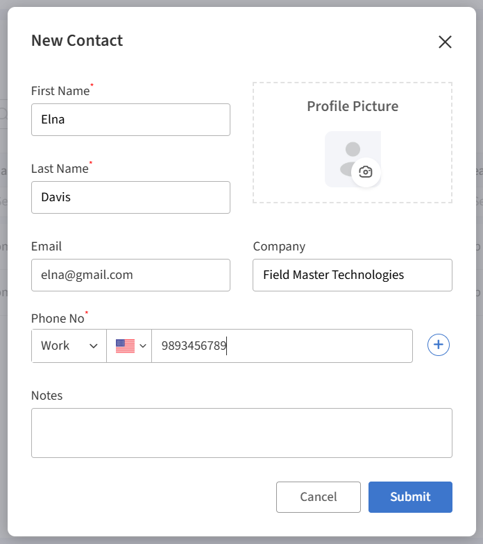 The ‘New Contact’ pop-up appears, where you can add the first name, last name, email id, profile picture, company name, phone number, notes (if any) and click on the Submit button.