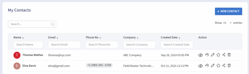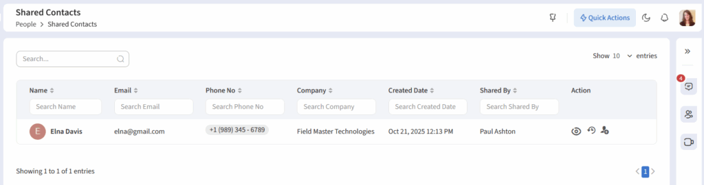 Click on the Submit button in the ‘Share Contact’ pop-up. All the contacts shared with any user will be displayed in their ‘Shared Contacts’ tab.
