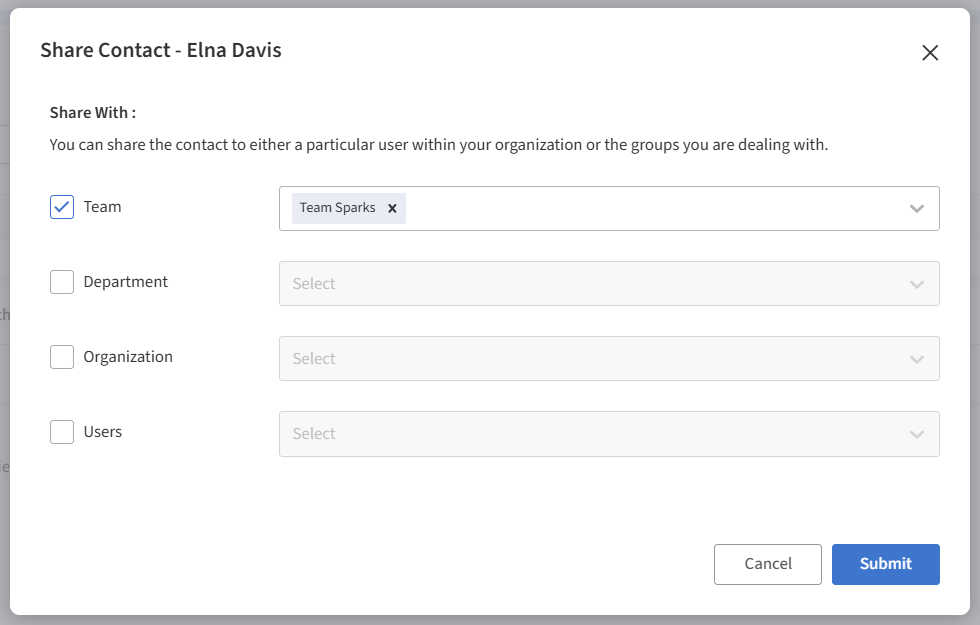 The ‘Share Contact’ pop-up appears, where you can share contacts to a department, team or to a user.