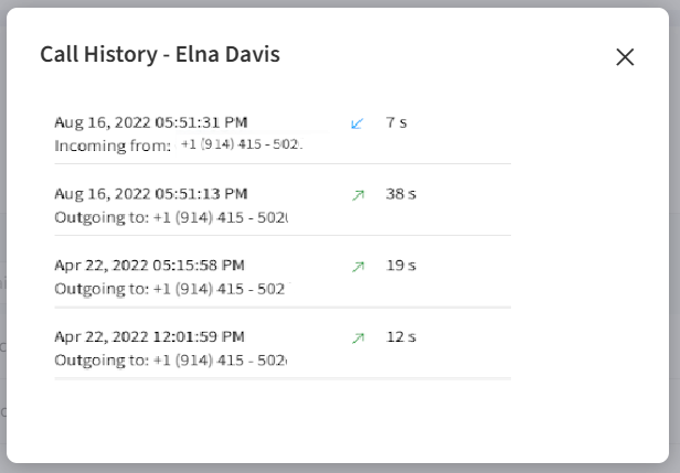 You can view the call history details of your contact in the ‘Call History’ pop-up.