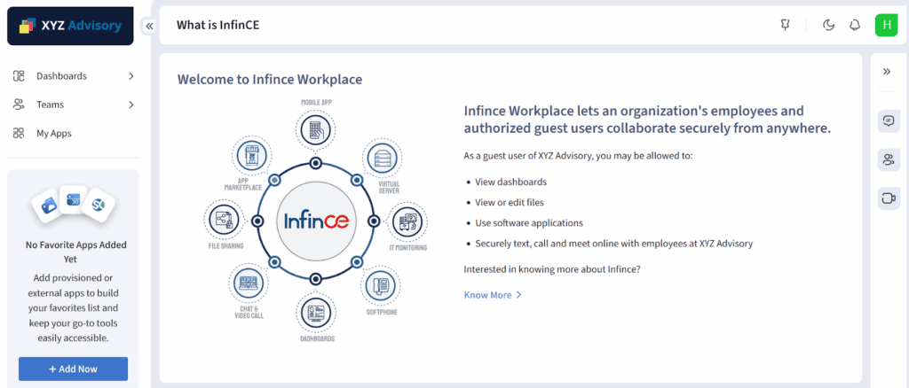 Infince Guest User feature facilitates easy collaboration between your employees and customers/business partners. Guest Users in Infince are the external users to whom we can provide limited access to select Infince features, such as Dashboards, Files, Meetings, Chat and Applications. Infince users with relevant permissions can invite the Guest Users by providing their email id.
