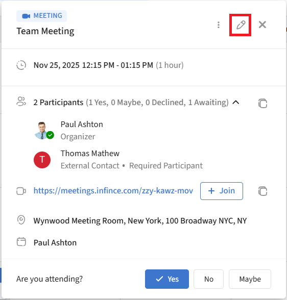 As an organizer or user with event edit permissions, you may edit existing calendar events. To do so, open the calendar event, click the three-dot icon, and select the Edit option.