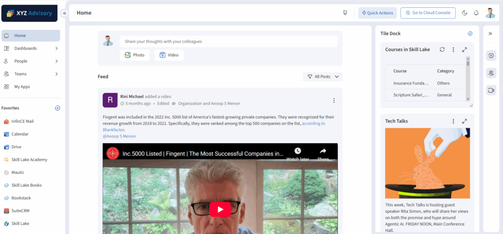 Infince Feeds helps you share your ideas and thoughts with your colleagues, engaging collaboration and boosting productivity. Feeds allow you to post messages and share photos and videos with a group or entire organization. You may like and comment on it.