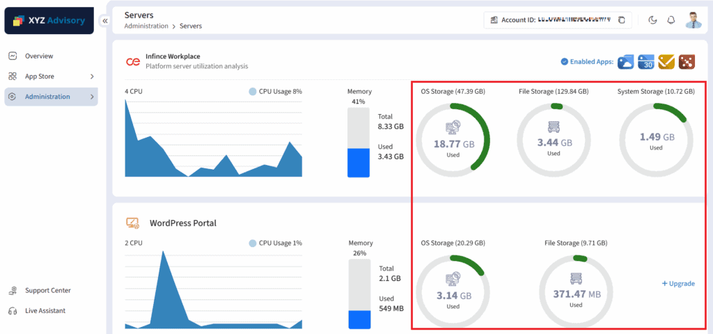For each server, you can monitor the CPU usage (left), RAM usage (centre) and the OS, File & DB (if present) storages along the right. If OS Storage is close to exceeding the available capacity for the Infince Workplace server, please contact Infince Support. Our team would get in touch with you to understand your needs and do the upgrades necessary for your requirement. For updating the System or File storage for the Infince Workplace server, refer Managing System Storage and File Storage. For updating the storage of your Application servers, refer Manage Application Storage and Servers.