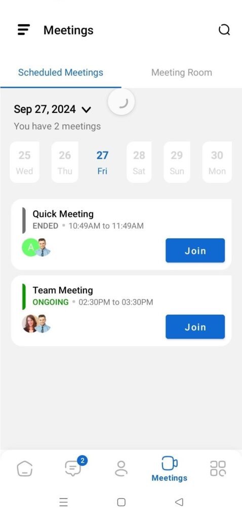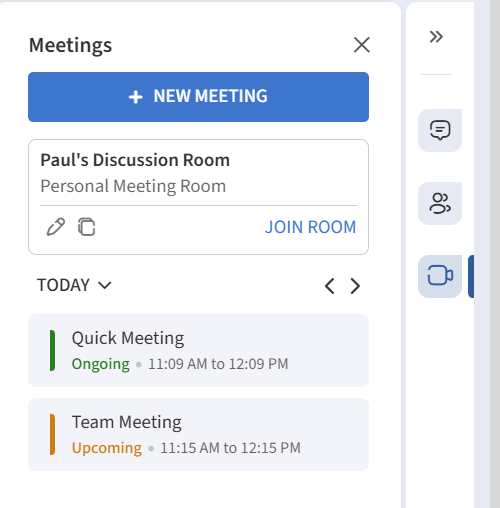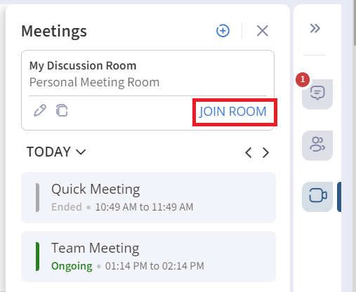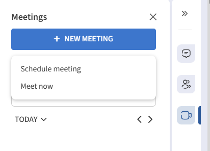 Click on the Meetings icon to open the Meetings panel. All the meetings scheduled will be displayed. You can see the meetings scheduled for today. To navigate to subsequent days, click on the right arrow. Click on the down arrow to pick a date from the calendar.