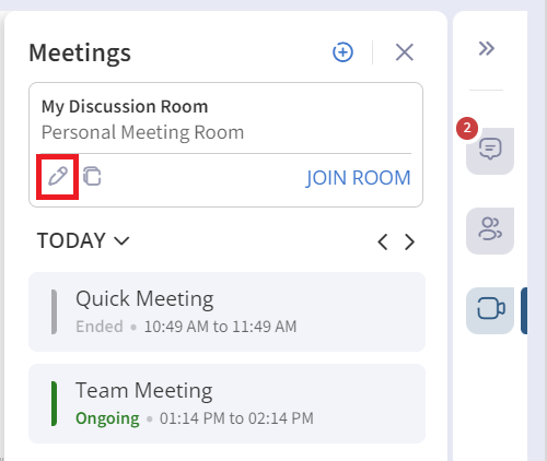 - Click on the Edit icon in the Meetings panel to edit the personal meeting room details.