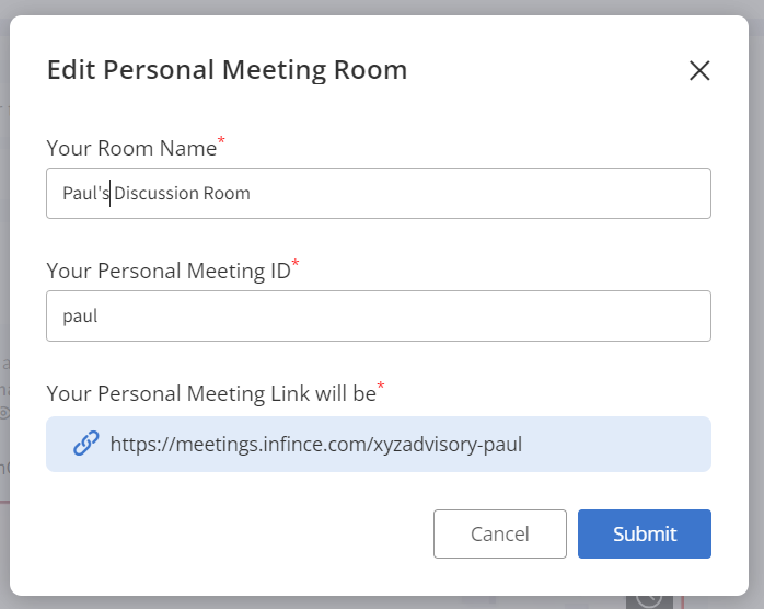 - In the ‘Edit Personal Meeting Room’ pop-up, you can edit the meeting room name, personal meeting ID and click on the Submit button.