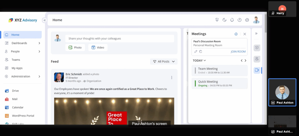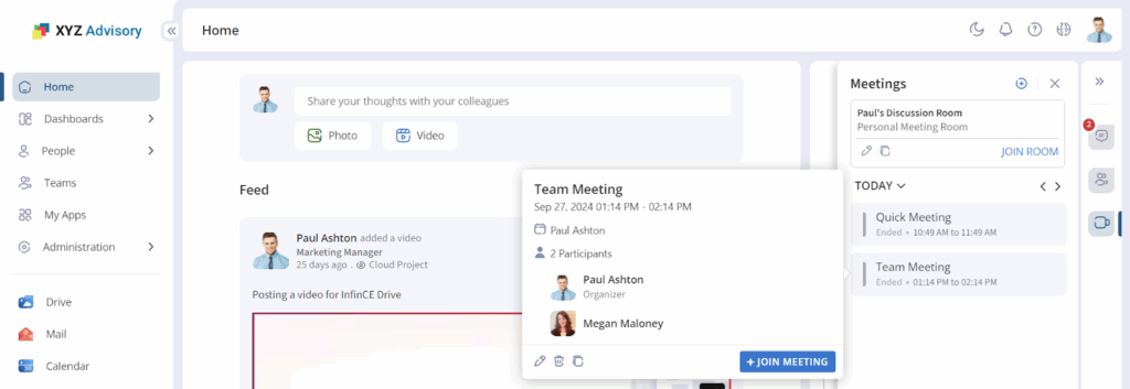 Online meetings provide a convenient way for people to connect anytime and anywhere. They offer an interactive way for meeting attendees to engage with each other. In addition, they reduce travel costs and disruptions because people can connect from anywhere. Infince Workplace provides the ability to host online meetings with participants from within your company as well as customers and business contacts who are not part of your organization.