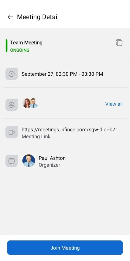 External participants can easily join the meeting at the scheduled time by just clicking on the link. They do not need an Infince login, and they need not download any other software.