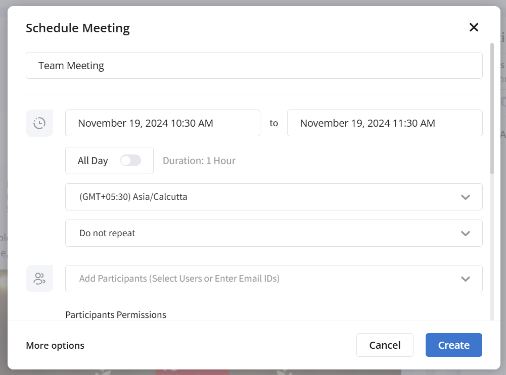 Infince Calendar is a workplace tool for efficiently scheduling meetings and events. When you click the Schedule Meeting option a popup will appear where you can fill in all the relevant details of the event. Click the More Options to expand the event creation window as a full page in the calendar app.