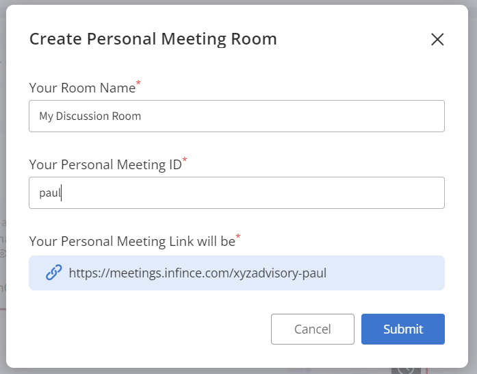- Enter your meeting room name, personal meeting ID and click on the Submit button. The meeting room URL is created based on your meeting ID. A confirmation message appears on creating the personal meeting room.