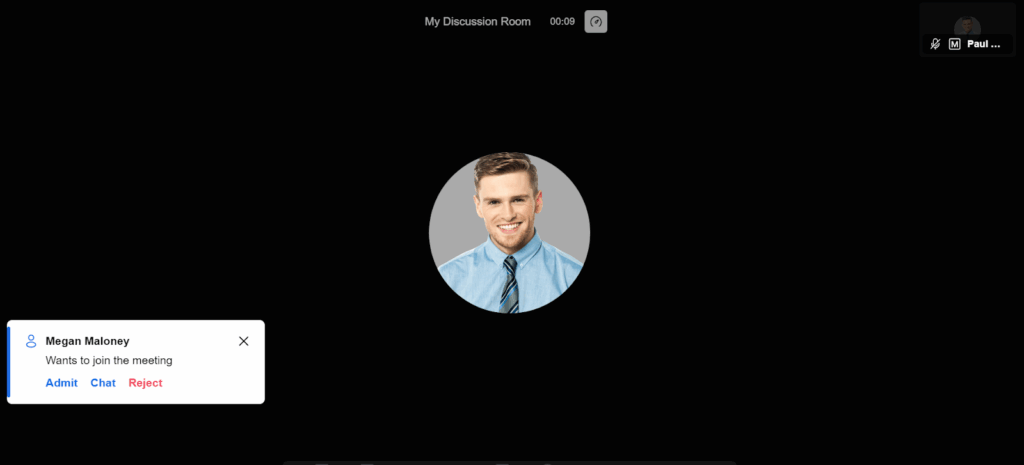 - The organizer can share the personal meeting room URL via chat. The organizer needs to click on the Admit icon to admit the invitee to the meeting room.