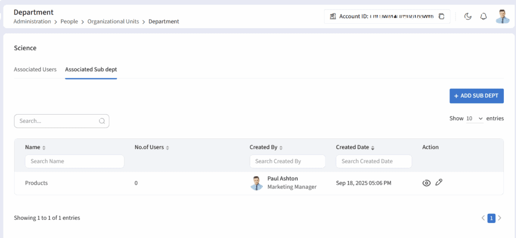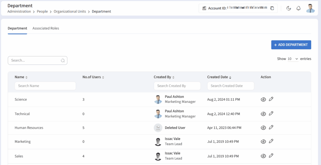 Within the OU page (e.g., Department), the page with the list of OUs (Sales, Finance, etc.) displays the OU details such as name, number of users associated with the OU, creation details, and the actions that can be performed for the OU. It is possible to edit the OU details, and view the associated users and sub-departments for this OU.