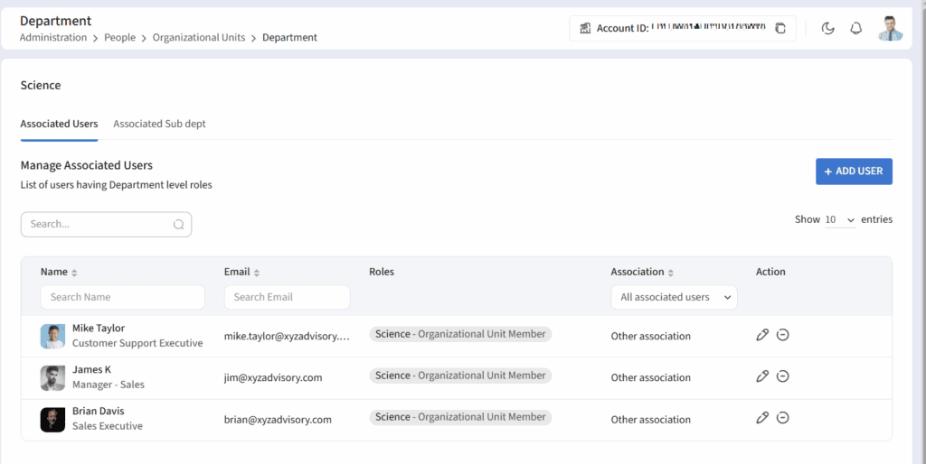 Click on the OU name or on the View icon against the OU to view the users associated with the OU. The user name, email id, the role the user is associated with, association details, and actions that can be performed for this user. Editing the user’s role and removing the user from the OU can be done here.
