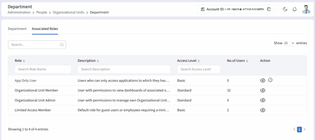 The Associated Roles tab within the OU page displays the role name, description, access level, and the number of users associated with this role. Click on the User count to view the users for the role and can also remove the role from the roles list.