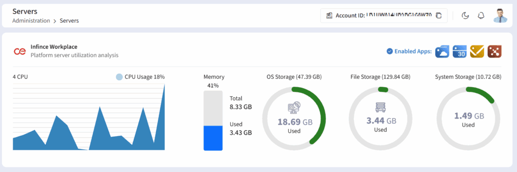 Go to Cloud Console and click on the Administration->Servers -> Infince Workplace to get the information regarding the usage of this storage.