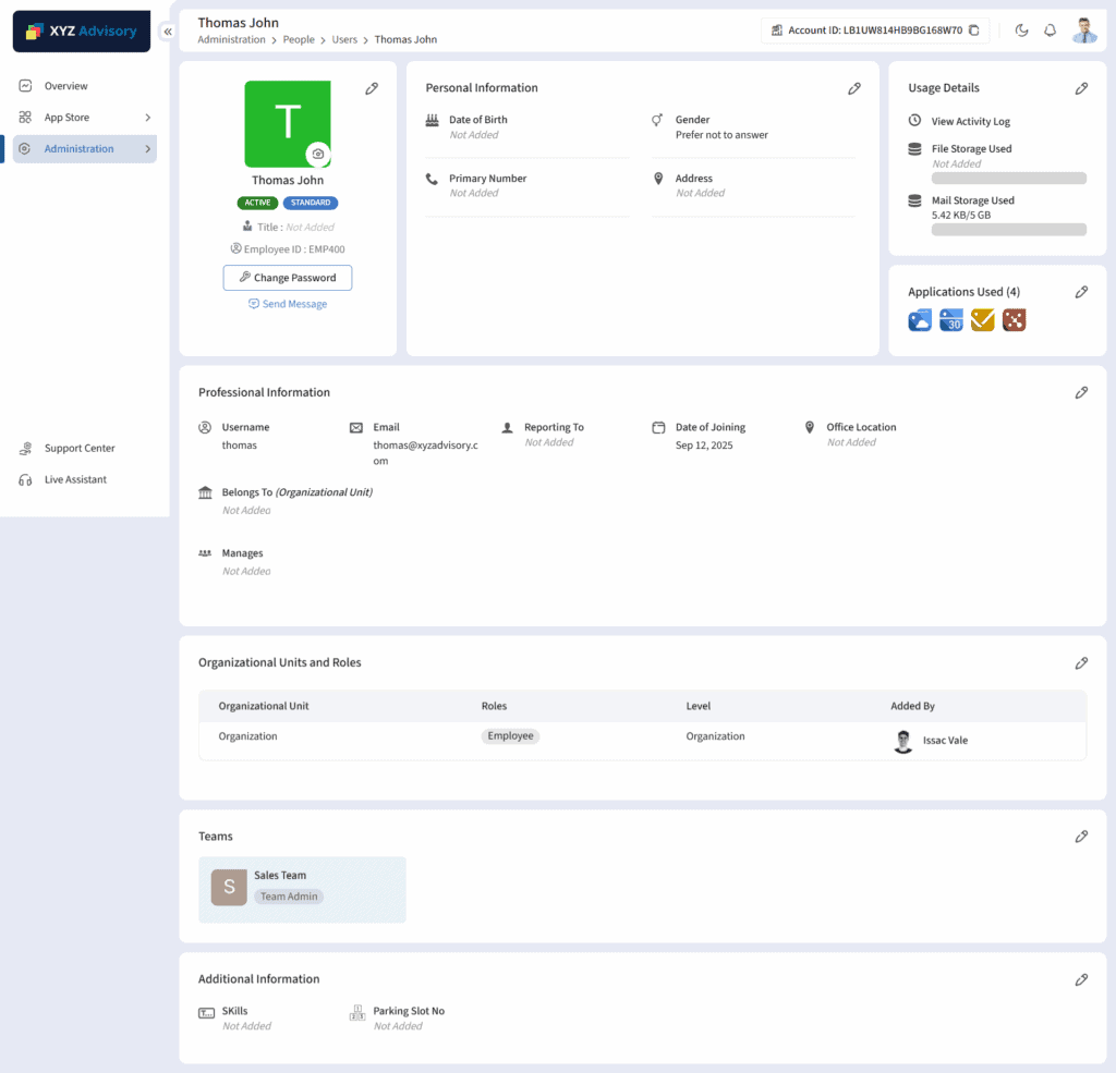Click the ‘View’ icon or user name to redirect to the employee profile page. You can view/edit the basic details, personal information, usage details, applications used, professional information, organizational units and roles, and team information of the user.
