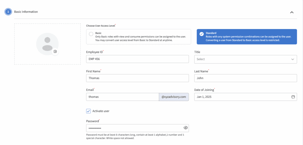 In the ‘Basic Information’ section, select the user access level, and enter the employee ID, title, first name, last name, email id and date of joining of the user. You can activate the user by setting a password or by sending an activation email to the user.