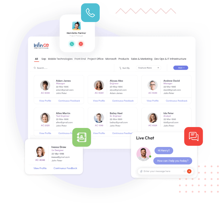 Initiate a call or chat with anyone in your organization directly from the Infince employee directory.